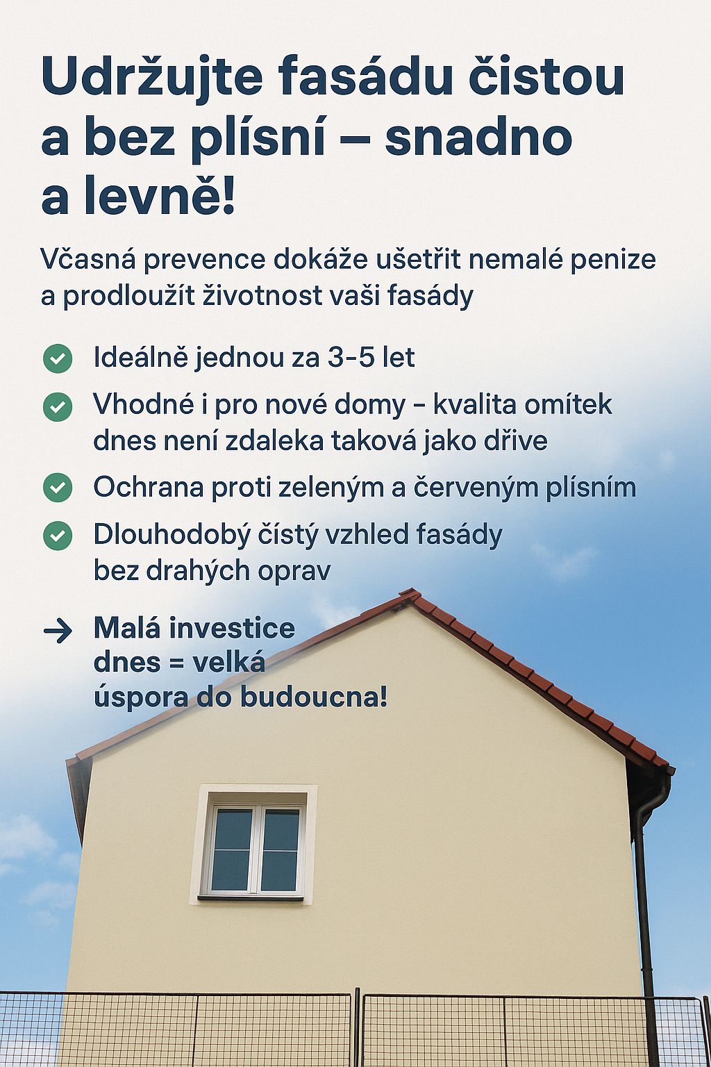 Údržba fasád, šetrné nebo vysokotlaké čištění fasád, ochrana proti mechům a plísní, čištění střech, okapů a čištění zámkových a jiných dlažeb. Možnost využití NANO technologie k odpuzování vlhkosti ze zdí.